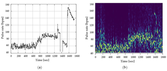 To illustrate the influence of jaw movements on the PPG signal, one participant was asked to chew chewing gum as well as to talk throughout the data recording. The effects on the PPG signal and the pulse rate can be clearly seen in Figure 8a,b. Figure 8a illustrates the pulse rate of the Cosinuss°One, Figure 8b shows the spectrogram of the PPG signal of the Dash Pro.