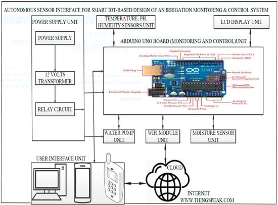 The low-cost autonomous sensor interface for the design of smart irrigation system architecture consists of the input and output processes, as illustrated in Figure 1. The entire system operation is controlled by the Arduino Uno board, which is programmed on the behavior of other system components [24]. The system consists of the following eight units: Power supply; water pump; WiFi module; soil moisture sensor; Arduino board; temperature, pH, and humidity sensors; user interface; and a 16 × 2 liquid crystal display (LCD) unit. The combination of these components makes the integration of the system easier to debug and provides optimal performance. The sensor values are uploaded on the Internet at 5-min intervals. The power supply unit provides a continuous supply of electricity to the smart irrigation system; it utilizes a 12 V transformer and a relay circuit. The system uses a generic AC 220 V to 12 V DC step down power supply module for Arduino generic PCs to power the board and the water Pump. A 12 V relay circuit is used to regulate and control the water pump. The board can be supplied with power, either from the DC power jack (7–12 V), the USB connector (5 V), or the VIN pin of the board (7–12 V). The power output is supplied to the Arduino board and the water pumping unit. The water pumping unit provides a mechanism by which adequate water in due proportion is supplied to the plants. This mechanism is programmed, controlled, and monitored by the Arduino Uno board. The Arduino board unit is the main monitoring and control unit. The Arduino Uno is a microcontroller board based on the ATmega328. It has 14 digital input/output pins, 6 analog inputs, a 16-MHz ceramic resonator, and a universal serial board. This unit is programmed using embedded C language to provide the necessary control signals to manage the entire irrigation system. The moisture sensor unit is responsible for measuring the soil moisture content of the water level of the soil, using the sensor uses capacitance to measure the water content of the soil. This is essential in smart agricultural practices, as it helps farmers monitor and control the smart irrigation system. In practice, this sensor, which is flexible and configurable, is inserted into the irrigation farmland i.e., soil to be examined and the volumetric water content of the soil is reported in percentage. The user interface unit provides a convenient interface to access and programme the sensors. The system users have the ability to interact with the system, using desktop, laptop, and smartphone devices. The LCD unit is a medium through which the microcontroller communicates with the user. The LCD unit is used to display sensed data readings from the sensors. The WiFi module unit is a self-contained system-on-chip (SoC) device with an integrated transmission control protocol/internet protocol (TCP/IP) stack, that provides access to a WiFi network. It has the capability of hosting an application or offloading all WiFi networking functions from another application processor. The module is a wireless local area network (WLAN) module with devices, based on IEEE standards. Furthermore, WiFi-compatible devices can connect to the Internet via a WLAN and wireless access point [25,26].