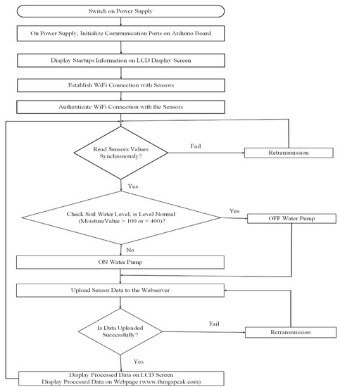 Figure 2 illustrates the real-time device monitoring and control system. The connected sensor components and ports are initialized to display the start-up information on the 16 × 2 LCD screen. The microcontroller subsequently attempts to establish connection with the different components of the system. As soon as the connection is established, the WiFi module and moisture sensors will authenticate the established connection and start reading the moisture content level of the soil. The readings are displayed on the LCD screen through the user interface window of the Arduino serial monitor. In situation whereby the sensor readings are not obtained, i.e., there is no established connection, a retransmission is possible. The real-time water level (moisture sensor) module is accessed through the Internet at the www.thingspeak.com interface to obtain the monitoring values from the sensors. The date and time when the data was sensed are recorded. The two sensors autonomously obtain the measurement of the indicated parameters, such as temperature, humidity, and moisture level. The recorded measurements are saved in the Internet server at thingspeak.com, along with the date and timestamp. After the recorded data are received, a descriptive chart is plotted to indicate the moisture level of the soil. The system is programmed to switch the pump ON and OFF, based on the soil moisture content, using the embedded C programming language, as illustrated in Figure 2.