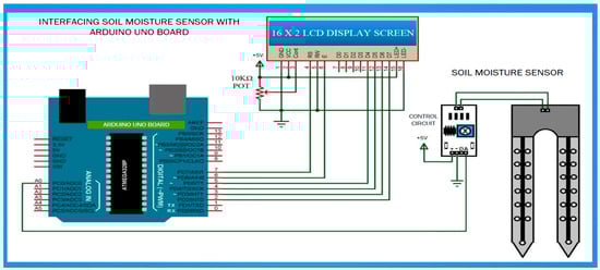 The low-cost sensor interface, for the smart irrigation system, is simulated using the Proteus 8.5 design suite, Arduino Uno integrated development environment (IDE), and embedded C programming language. Proteus 8.5 Professional is an efficient tool and a high-performance design environment for simulating technical computing [25]. It integrates computation and the virtual representation of the systematic operation of the system, displaying how the constructed system components will work. Arduino, as the development board, provides an IDE, by which source codes can be written, verified, and uploaded to the microcontroller. Arduino is an open-source electronics platform that provides hardware/software co-design tools for designing embedded applications [24]. The embedded C programming language is suitable for the design of embedded systems and sensor components. The codes, written in embedded C language, allow the circuit or devices to achieve their optimal performance. In addition, it has a failure rate of less than one percent when developed to interact with hardware components. The Proteus 8.5 is a professional PCB design tool that can be integrated with a shape-base auto router; it provides features, such as fully featured schematic capture, highly configurable design rules, and interactive SPICE circuit simulation. Proteus design combines the ISIS schematic capture and ARES PCB layout programs to provide a powerful, integrated, and easy-to-use tool suite for educational and professional PCB design. Figure 3 illustrates the basic schematic components of the autonomous sensor interface for the smart IoT-based irrigation system. The moisture sensor, 16 × 2 LCD, transformer, light-emitting diode (LED), diode, Arduino Uno (microcontroller), water pump, power regulator, relay circuit, and many other devices constitute a complete irrigation monitoring and control system. Another approach is the use of a field-programmable gate array and system-on-chip for the monitoring and control system [26,27,28].