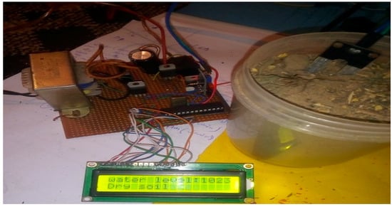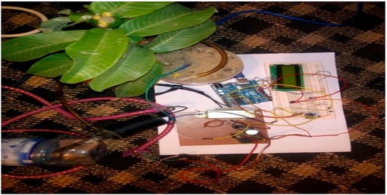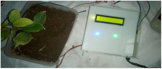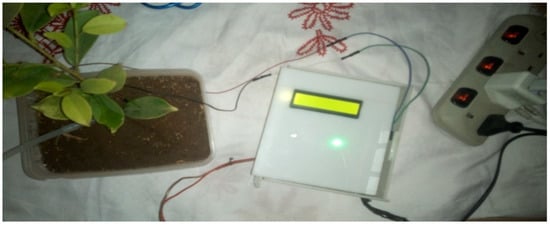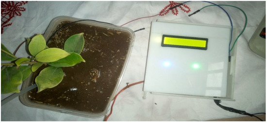 The implementation of the low-cost autonomous sensor interface, for a smart IoT-based irrigation monitoring and control system, establishes that the new system is operational and satisfies the operational requirement of the user for measurement and evaluation. The important parameters to be measured, by the smart system, have been defined and are well-established. The moisture sensors are buried in the ground at the required depth of 2 cm. Once the soil reaches the desired moisture level, the sensors send a signal to the microcontroller to turn off the relay circuits, which control the water pump. The implementation can be tested in the designated location. These tests include, arranging the constructed system prototype at a strategic location in farmland, such that the environmental parameters would be monitored by the sensors. The processed sensor data are transmitted to the web server through the website, www.thingspeak.com [27], where users can view the monitoring and control data. Figure 6, Figure 7, Figure 8, Figure 9 and Figure 10 illustrate the experimental setup of the autonomous sensor interface for the IoT-based irrigation system. The components are interconnected via a smart interface, the water pump is connected to the plants to supply water when the moisture level of the soil is below normal, and the immersed moisture sensor, buried in the soil, monitors the moisture level and communicates the information to the microcontroller. Thereafter, the monitored and control information is transmitted to the LCD screen, and uploaded to the web server, through the WiFi module. Figure 11 and Figure 12 demonstrate the implemented prototype.