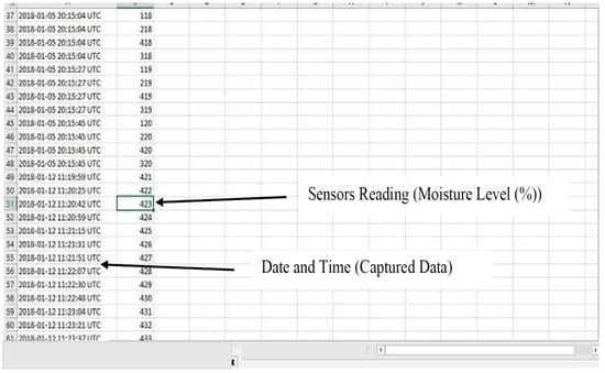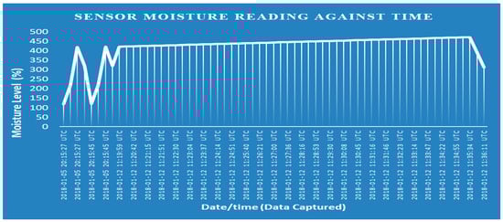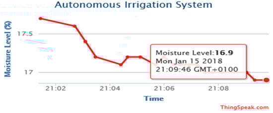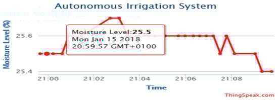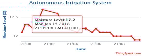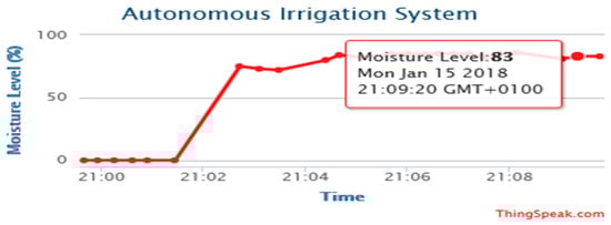 The calibrated data, captured by the sensors, are transmitted to the web server [27]. The moisture sensor sends data, through the WiFi module to www.thingspeak.com, is accessible via a phone or personal computer. Here, the logged data of the moisture content values, with the appending date and time, are shown in the serial terminal, as illustrated in Figure 13. The numerical data can also be downloaded and saved in comma-separated values (CSV) or the excel file format. It is important to obtain the moisture content values, in order to demonstrate the efficiency and data integrity of the developed system prototype. This represents significant advances in irrigation system technology, particularly in the present age of serious advancements in sensor technology and creativity.