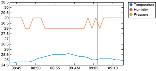 Variation of soil temperature, humidity, and pressure measurements obtained from http://www.thingspeak.com (API key = FE4H530DNA2NJQXB).