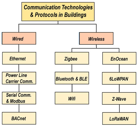 Modern-day buildings can be equipped with a wide range of state-of-the-art wired and wireless communication technologies and protocols for the interconnection of various building systems and processes, such as the monitoring and storage of sensor information, data communication and processing in building management systems, and the functioning of equipment and utility appliances etc., (see Figure 1). Wired technologies such as Ethernet, Serial Communication (RS232/RS422/RS485), etc., tend to be more secure (as these connections are typically housed behind a Local Area Network (LAN) firewall meaning there is no transmitting data susceptible to interference), have fast data transfer speeds (as they are less affected by physical hindrances (walls, ceilings, etc.) and signal interference/distortion from other electronic devices), and tend to be more reliable in most cases (as they are less prone to disconnections, and do not require constant debugging and troubleshooting). On the other hand, wireless technologies such as Zigbee, WiFi, Bluetooth, EnOcean, etc., are more scalable and mobile (as there is no need for extensive hardware installations especially, inside walls, ceilings, etc.) and generally, cost less to the end user (as there are no additional cable installation/repair and labor costs). Although wired technologies have been more commonly used over the years, recent literature suggests that wireless technologies are now becoming increasingly ubiquitous due to vast improvements in speed, security, reliability, and an ever-increasing variety of technologies and standards to choose from [,,,,]. Although both sets of technologies have a place in the market, it is vital to assess the viability and current status of each technology to ensure that building designers, owners and occupants can choose the most suitable technology candidate to meet their respective requirements. The following sub-sections present an overview of the most prominent and commercially available wired and wireless communication technologies and protocols used in buildings (shown in Figure 3) with their key characteristics compared in Table 3.