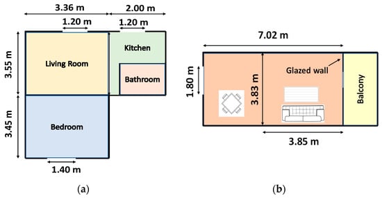 (a) Floor plan of a one-bedroom apartment in Southampton, UK. (b) Typical apartment living room configuration in San Sebastian, Spain [].