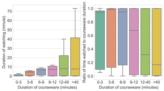 Distribution of a user’s watching time and the ratio of watching time to video duration for various durations of video courseware.