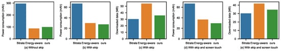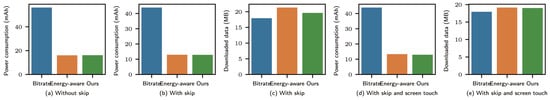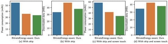 With skipping and screen touching: We used the previous sequence of operations and added a screen touch between every two operations. The experimental results are shown in Figure 3d,e. From Figure 3d, we observe that bitrate streaming remained stable compared with the second case. However, according to the energy consumption, our scheme outperformed the energy-aware algorithm by 19.14%. In this case, screen touching was added, and the download time of bitrate streaming would increase for the energy-aware algorithm; however, the video was not skipped at this time.