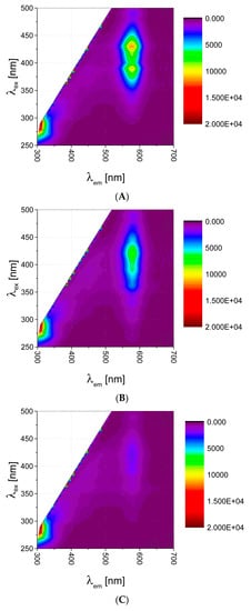 EEMs were measured over spectra ranges of 250–500 nm (excitation) with a data interval of 10 nm and 300–700 nm (emission) with a data interval of 2 nm, at 25 °C, using Synergy 2 Multi-Mode Reader fluorescence spectrometer (BioTek Instruments, Inc., Winooski, VT, USA). It resulted in 26 × 201 data matrix per sample. Exemplary EEMs are presented in Figure 1. For further data analysis each matrix was unfolded to a vector of 3915 features (missing data, i.e., white areas on EEMs, Figure 1, were omitted). Similar strategy we applied in our previous research on 2D fluorescence [15,16].