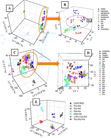 PLS-DA score plot for identification of neurotransmitters (A,B), amino acids (C,D) and oligopeptides (E).