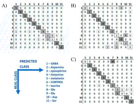 Confusion matrixes of PLS-DA models applied for neurotransmitters identification: (A) QDs-assisted 2D fluorescence in pH 5.0; (B) QDs-assisted 2D fluorescence in pH 7.0; (C) data fusion of (A,B).