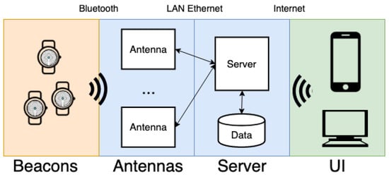 Generally, traditional proximity detection systems place tags in fixed positions within the environment, and track smart devices that move in the space. On the contrary, the proposed system has been designed to reverse this approach: Bluetooth beacons (tags) are the mobile devices, while a set of smart antennas are installed in both internal and external environments. The proposed localization system is designed to operate in large structures with a consistent number of patients (in particular people affected by mild cognitive disabilities such as dementia) and caregivers. Due to specifications, the system has to be a coarse grained localization system meeting the necessary trade-off among costs, computational effort, and privacy. The localization system is RSSI based, with the proximity detection method and a set of constraints mechanism in order to avoid wall crossing. The system is composed of three main components (Figure 2): tags, antennas, and server.