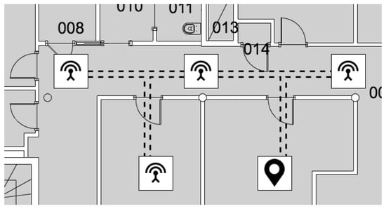 As previously described, the implemented localization method is proximity based with a mechanism of wall crossing avoidance. Since essential areas are typically not adjacent, a new set of nodes has to be added: the auxiliary antennas. Auxiliary nodes are fundamental for the implementation of the wall-crossing avoidance mechanism. For example, referring to Figure 4, when a person is in the bathroom he/she is in the intersection area of the two antennas located in rooms not physically accessible; in this case, the fluctuations of the Bluetooth signal is sufficient to make the person bounce back and forth between the two rooms. As also described in Section 2.1.2, in order to increase the reliability of the system, if antennas are not adjacent, the localization system freezes the patient waiting for an increased value of the likelihood. Auxiliary antennas represent the way to specify physical path among rooms having antennas that interfere without violate the physical constraints. Typically, an auxiliary antenna is placed when the sensitivity range of multiple essential antennas are overlapping each other and no physical connection between rooms exists; this occurs inevitably in most cases. It is worth noting that the sensitivity range of auxiliary antennas should be slightly overlapped with any other essential areas.