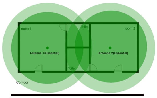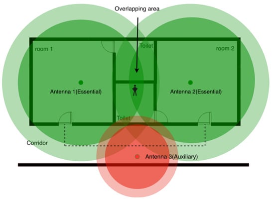 Figure 5 shows the function of auxiliary antennas intuitively. If an inhabitant stays in the toilet (the overlapping area) of one bedroom, a localization error can easily happen: a person could pass from one room to another. The approach consist in placing a new auxiliary antenna on the corridor; thus, the jump from one room to another room is hindered.