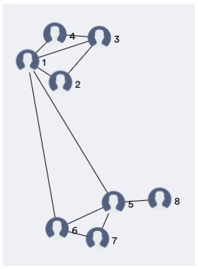 The evaluation of this index among people in a community allows creating a graph of the personal relationship. An example is provided in Figure 9, where people are represented by nodes, and relationships are represented with arches: the length of an arch is proportional to the relational index between the two persons.