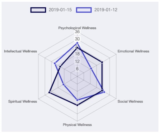 The wellness models proposed in Section 1.1.2 agree that in order to obtain an overall assessment of an individual’s status, all its dimensions must be taken into account. Although the discussion of the psychological domain is outside the scope of this work, it is worth to stress how much it is connected to health []; indeed, Grossi et al. [] speaking of positive technology, support the importance that technology can have in improving people’s quality of life. For this reason, the proposed system includes a tool to support the activity of doctors and clinicians in evaluating the psychological activity of patients in an health-care facility. This tool allows visualizing questionnaire in a graphical form, allowing professionals to evaluate the evolution of each dimension of the individual’s wellness over time. Figure 10, for example, shows the outcome of the PWS questionnaire.