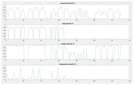 The collected data have been subsequently analyzed to retrieve daily wellness indicators for every patient of the facility. Figure 11 shows the movement index, the sleep index, the isolation index, and the independence index for a single patient over the 130 days of data collection. Indexes take values between 0 and 1 as reported in Section 2.2. Doctors and professionals of “Il Paese Ritrovato" can view this chart for weekly, monthly or six-monthly periods to assess patients’ well-being.