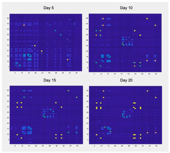 Finally, as it has been previously described in Section 2.2.2, the collected dataset also provides an indication of the interpersonal social relations. Figure 12 shows the evolution of the relational index of the patients evaluated in four time instants every 5 days. This type of visualization is made available to the staff of “Il Paese Ritrovato" to have an indication of the relationships that are being formed between couples or groups of patients. Higher values of the relational index are colored in yellow and indicates a frequent interaction between the related patients, while lower values are colored in blue. This matrix is reported for four different time instants, every five days: it is possible to notice, in a purely qualitative manner, groups of connected people and to highligt changes over different periods of time.
