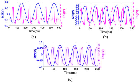 Input–output curve of the clock circuit for zero-crossing detection at different input frequencies. The blue curve is the AI signal and the pink curve is the output trigger signal of the clock circuit. (a–c) Nominal input frequencies of 5 MHz, 20 MHz, and 12.5 MHz, respectively.