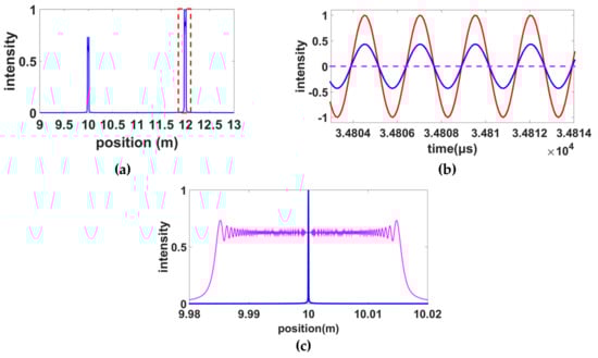 Two reflection points on the measured fiber were simulated and their OPDs (roundtrip) were 20 m and 24 m. The second reflection point was the reference point used to correct nonlinearity. Figure 7a shows the OFDR trace in the spatial domain. It can be seen that the peaks were broadened centered at 10 and 12 m, resulting from the tuning nonlinearity of the laser. The spatial resolution was, therefore, deteriorated. In Figure 7b, the blue curve represents the ideal interference pattern in the temporal domain, which is the interference between the ideal reflection at the position of 24 m and the local light. The red curve represents the result after the inverse fast Fourier transformation (IFFT) operation (before the phase calculation) shown in Figure 6. It can be seen that the recovered interference pattern had the same phase as the ideal interference pattern. Therefore, the self-reference method had the same effect as the conventional auxiliary interferometer shown in Figure 3. Figure 7c compares the results with and without nonlinearity correction using the self-reference method. It can be seen that, after the nonlinearity correction, the Fourier transform-limited spatial resolution can be achieved.