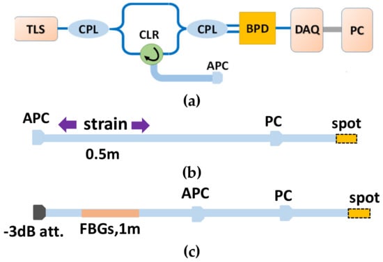 The OFDR system using self-reference for the nonlinearity correction was similar to the system shown in Figure 3. However, as shown in Figure 8a, only the main interferometer was kept. The TLS swept from 1540 nm to 1560 nm, and its nominal tuning speed was 40 nm/s. The sampling rate of the data acquisition card (DAQ) was10 MS/s. Two configurations were investigated. The first is shown in Figure 8b. All segments were composed of a single-mode fiber. The second is shown in Figure 8c. The fiber part between the −3-dB attenuator and the APC connector was a Ge-doped fiber with 1-m-long dense weak FBG arrays inscribed in the middle. Each single FBG had a length of 8 mm and a gap of 2 mm. The weak FBG arrays were made using a phase mask and UV light. The nominal central wavelength was 1550 nm. A 3 dBattenuator was inserted before the sensing segment to reduce the incident light power. The PC connectors in the two configurations were used as the reference reflectivity point in the process of nonlinearity correction.