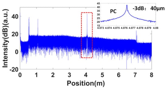 Firstly, the spatial resolution tests for these two configurations were performed. The equal phase intervals in the self-reference for the nonlinearity correction were all set to . Figure 9 shows the measured OFDR trace of configuration 1 without nonlinearity correction. The FWHM of the PC connector was about 1.5 m. Then, the band-pass filter shown in the red dashed box in Figure 9 was used to extract the optical phase information of the laser. The correction process followed the process shown in Figure 6. The corrected OFDR trace is shown in Figure 10. The inset is the reflection of the PC connector. The FWHM of the PC connector was about 40 μm, which was equal to the Fourier transform-limited spatial resolution. Figure 11 shows the measured OFDR trace of configuration 2 after nonlinearity correction. The left inset in Figure 11 is the attenuator. The distance between two APC reflectivity planes was about 2 cm, which is in agreement with the practical value. The right inset in Figure 11 is the beginning of the FBG arrays. It can be seen that the FBG was about 10 dB higher than the Rayleigh scatter level. The interval and reflectivity strengths were even. From the results of the spatial resolution tests, the nonlinearity correction method using self-reference was effective. The structures on the measured fiber were all distinguished and measured with high accuracy and resolution.
