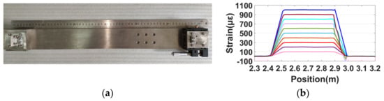 Then, the distributed sensing tests were implemented. The distributed strain was measured using the conventional demodulation method demonstrated in References [,]. The nonlinearity correction was achieved using the self-reference method. The gauge length was set to 1 cm. The stretching part was a single-mode fiber with acrylate coating as shown in Figure 8b. The measured fiber was stretched by a nanometer stage as shown in Figure 12a. The device could generate a standard strain calculated by , where is the elongation length of the fiber and L is the original length. The distributed strains are shown in Figure 12b. Thus, it is certain that the self-reference method does not influence the classical distributed strain demodulation in OFDR.