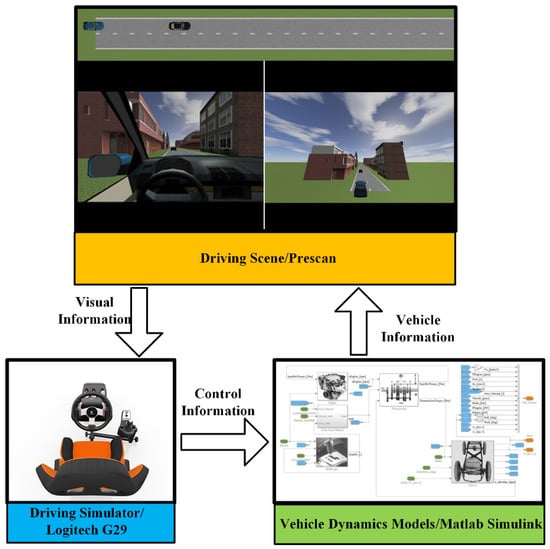 As shown in Figure 2, driver data can be collected by the Logitech G29 driving simulator through the human-in-the-loop experiments. For real applications, the driving data can be obtained through the on-board sensing system. The vehicles involved in the experiments are modeled by the typical 2-D vehicle dynamics models (single-track model), which are embedded in Matlab/Simulink. The traffic environment and the driving scene are simulated in PreScan, which is connected to the driving simulator and provides drivers with the visual information. Two groups of experiments with different speed profiles—constant speed (CS) and variant speed (VS)—for the leading vehicle are carried out to evaluate the performance of the proposed system.