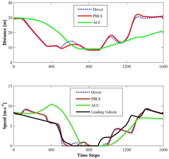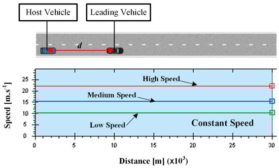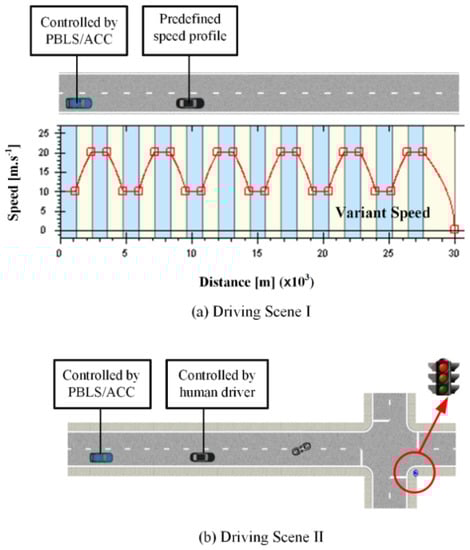 The ACC system is a widely used longitudinal speed control system, which is designed to assist drivers to keep a pre-set time headway between the host vehicle and the leading vehicle [35]. The time headway is defined as the ratio of the distance () to the speed of the host vehicle (). The desired time headway for ACC is set as 1.8 s in the test, which can keep between 20 m and 40 m when the leading vehicle has a speed between 10 m·s−1 and 20 m·s−1. In this way, the kept by ACC and PBLS can be ranged to the same level, which helps to make a fair comparison.