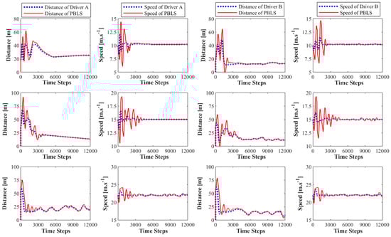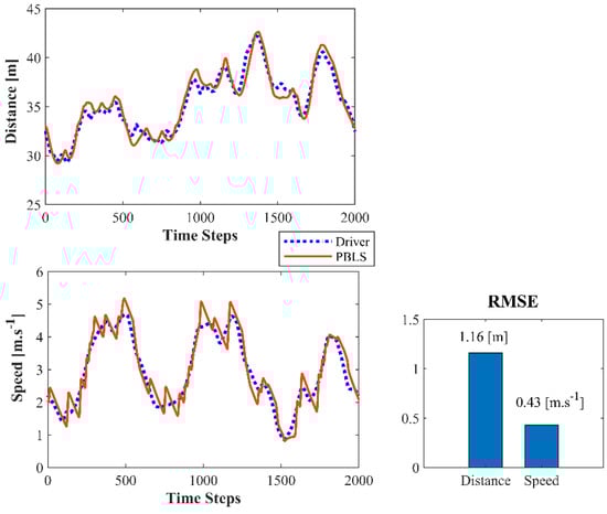 Figure 4 presents the learning curves of PBLS for different speed scenarios. In all three scenarios, the learning system can learn the stable distance and the speed curves within 5000 time steps (250 s). As shown in Figure 5, in the low speed scenario, the learning RMSE for both the speed and the distance of two drivers can be kept at a very low level close to zero. However, with the growth of speed for the leading vehicle, the performance of PBLS gets worse with RMSE for the speed increasing from 0.01 m·s−1 to 0.37 m·s−1 and RMSE for the distance increasing from 0.05 m to 2.43 m. This result is reasonable, as in the low-speed scenario, both drivers can perform well in keeping a stable distance to the leading vehicle. In this situation, the curves for speed and distance are very smooth without large fluctuation after around 5000 time steps, and thus PBLS performs better in this scenario.