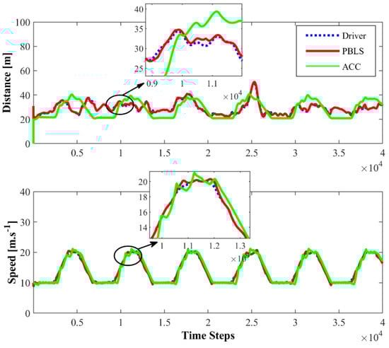Figure 7 presents the distance and the speed comparison among the driver with PBLS and ACC in the first driving scene. PBLS performs well in learning from the driver with the distance and the speed curves close to the driver, which means the learning error (RMSE) of PBLS is at a very low level.