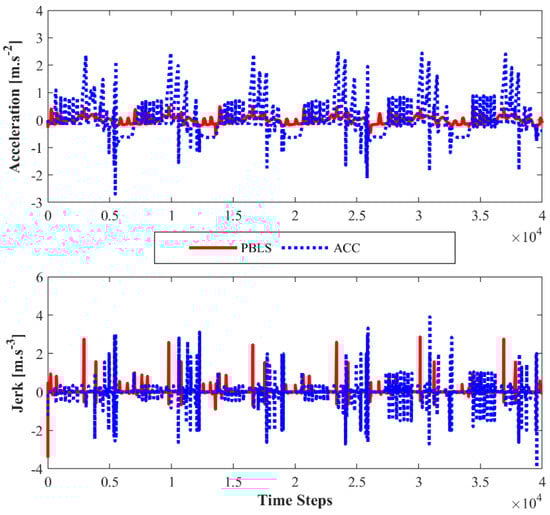 Two indicators suggested by [36] are used here to evaluate and compare the performance of PBLS and ACC on driving comfort and smoothness. These two indicators are given by: