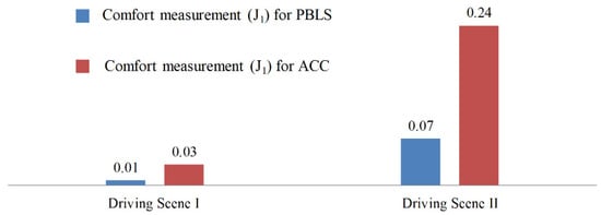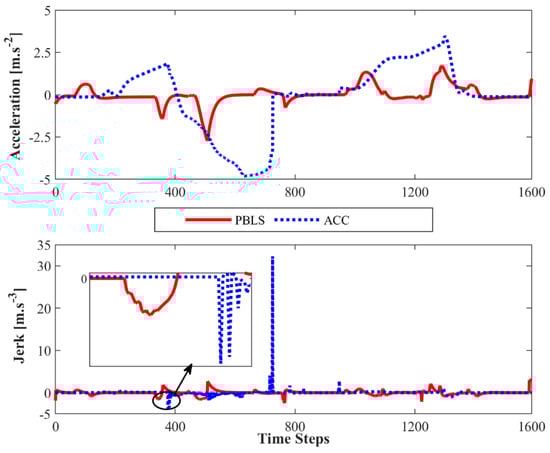 Compared to PBLS, the speed of ACC fluctuates more greatly, especially when the speed is close to 20 m·s−1. As shown in Figure 8, the acceleration and the jerk () of ACC vary significantly during the whole test, while PBLS can keep a relatively stable curve for both the acceleration and the jerk. Thus, PBLS can provide better driving smoothness than ACC.