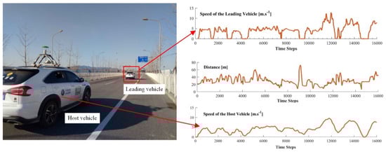 In the first test, the leading vehicle keeps a constant speed, and three speed profiles, namely, low speed (L, 10 m·s−1), medium speed (M, 15 m·s−1), and high speed (H, 22 m·s−1), are designed to form three different test scenarios. To test the adaptive learning ability of the proposed system, two drivers (A and B) are involved and asked to follow the leading vehicle in all three scenarios. Then, the learning system is triggered to learn the driving behavior from these two drivers. It should be noted here that the focus of this study is to develop a personalized learning system that has the ability to adapt to different driving behaviors. This kind of adaptation can be tested by involving two different drivers in this section. Analytical work involving more drivers can be considered in our future study to analyze the algorithm performance under various kinds of driving behaviors.