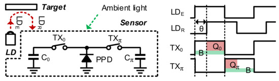 As shown in Figure 1, an IR laser diode (LD) emits modulated light. The iTOF sensor calculates the depth according to the phase difference θ between the emitted light LDE and reflected light LDR. Two electronic shutters TX0 and TXπ in a pixel are modulated in-phase (synchronized with the LD) and out-of-phase, respectively. The typical modulation frequency is >10 MHz. The sensor detects a photogenerated current (IPIX) in a pinned photodiode (PPD), which is integrated to obtain the charges Q0 from TX0 and Qπ from TXπ. Then, θ can be calculated as follows: