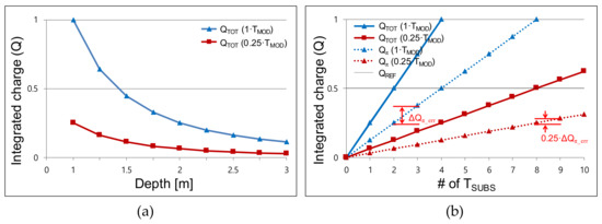 Requirement of the adaptive modulation time with multiple TSUBs: (a) integrated total charge (QTOT) according to the distance with the adaptive modulation time; (b) integrated QTOT and Qπ according to the number of TSUBs with the adaptive modulation time.