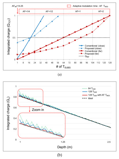 Figure 4a shows the integrated QTOT along the sub-integration time. Both the cases with and without the adaptive modulation time are shown. We reduce the increment of Q for the first 24 TSUBs by applying a small AF (TMOD/4), because the integrated QTOT generated from the short-distance objects has an abrupt transition along the distance. In this case, we have a large error that arises from the difference between the integrated QTOT (at the 24th TSUB) and the reference QREF (QTOT − QREF). By reducing the TMOD to TMOD/4, the error can be suppressed owing to the decreased increment of Q. However, for the long-distance objects, the rate of the charge integration is too low because of the reduced TMOD. Therefore, from the 25th TSUB to the 128th TSUB, we gradually increase the TMOD from TMOD/2 to 2·TMOD such that the integration of the small Q reaches QREF. Note that only the first TSUB has a large AF (14.25). This is because the large initial Q (integrated in the 1st TSUB) accelerates the time to reach QREF within 128·TSUB. Without a large AF in the first TSUB, the integration of the small Q (in the case of long-distance objects) does not reach QREF.