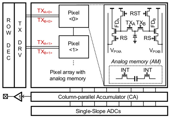 Figure 5 shows the overall architecture of the proposed sensor chip. The sensor chip consists of an array of pixels with an over-pixel AM, a TX driver, and a row decoder for driving and selecting pixels, a column-parallel accumulator (CA) for accumulating charges from the pixels into the AM, and a unity-gain buffer for the output. The pixel consists of a PPD, two reset transistors (RST), two row-selection transistors (RS), two source follower transistors, and two electronic shutters (TX0 and TXπ). Additionally, the AM (including one capacitor and two access transistors) is placed to store an intermediate Q during the integration time. After the overall operation is finished in a frame, this AM stores the acquired ΔQπ in a given frame, which becomes the previous frame signal in the next frame.