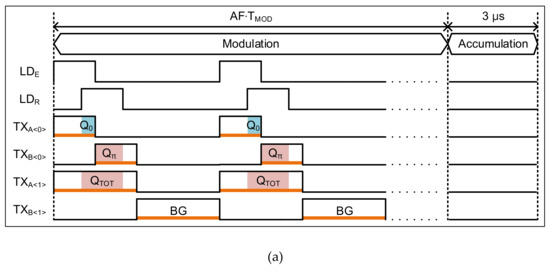 The timing diagram of Figure 6a illustrates the operation in a single TSUB in one frame. Each TSUB consists of two operation phases: (1) modulation, and (2) accumulation and the first comparison. The detailed operation is as follows: the first phase is the modulation phase, where Q0, Qπ, and QTOT are integrated in the floating-diffusion (FD) nodes of pixels by modulating the electronic shutters TXA and TXB. After the modulation phase, four signals (Q0 + BG, Qπ + BG, QTOT + BG, BG) are generated. These signals are stored in the FD nodes FDA and FDB of the two pixels. The second phase is the accumulation and first comparison phase. In the second phase, the integrated ΔQTOT (from pixel<0>) until the current TSUB and ΔQREF are compared. If ΔQTOT is larger than ΔQREF, ΔQπ (from pixel<1>) is stored in the AM. In this case, ΔQπ is no longer stored in the AM from the next TSUB. Therefore, the ΔQπ acquired when ΔQTOT reaches ΔQREF is preserved in the AM. When ΔQTOT is smaller than ΔQREF, ΔQπ is still stored in the AM. However, in this case, a new ΔQπ is stored in the AM in the next TSUB. After 128∙TSUB (= 1 frame), the ΔQπ stored in the current frame and the ΔQπ stored in the previous frame are accessed through the amplifier to be compared.