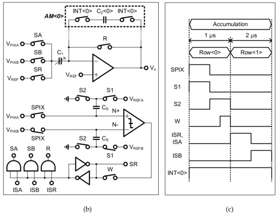 The circuit operation, along with a timing diagram, is shown in Figure 6c. At t1, even pixels (row<0>) are selected. The switches SA and SAD are enabled. Then, two outputs of the source followers (VPIXA and VPIXB) are sampled on CS. At this time, VPIXA is VRST − BG/CFD, and VPIXB is VRST − (QTOT + BG)/CFD. At t2, the switch SB is enabled. Then, the comparator inputs N+ and N− experience voltage drops based on VREFA and VREFB. We set VREFB as VREFA + QREF/CFD, such that the comparator compares QTOT with QREF. Therefore, if QTOT > QREF, the comparator generates an output of “1”. At t3, the switch SE is enabled to store the comparator output in the SRAM. At t4, odd pixels (row<1>) are selected. Additionally, AM<0> is selected by enabling the INT<0>. Then, the switches RINT and ISM1 are enabled. If the SRAM is storing “0”, the accumulation of ΔQπ to the AM is required, because QTOT has not reached QREF yet. In this case, VPIXA (= VRST − (Qπ + BG)/CFD) is sampled on C1 for the accumulation. Simultaneously, the C2 for AM<0> is reset by unity-gain feedback. If the SRAM is storing “0”, no accumulation of ΔQπ is required, because QTOT already reached QREF in the previous TSUB, and the final ΔQπ is already stored in the AM. In this case, the reference voltage VREF is sampled on C1 instead of sampling the VPIXA. By fixing the input as a constant VREF, no accumulation is performed in the accumulator. Moreover, the AM is not reset, for preserving the stored ΔQπ. At t5, ISM2 is enabled for the accumulation. Simultaneously, VPIXB (= VRST − (Q0 + BG)/CFD) is input to the capacitor C1. This accumulation is performed only when the SRAM is storing “1”. Finally, the output of the CA is