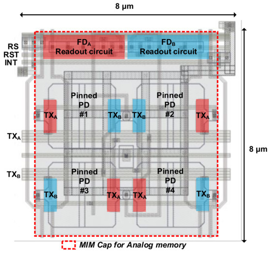 Table 1 presents the chip characteristics. Figure 8 shows the pixel layout with an AM. To minimize the distance of charge transfer in the PPD within a short modulation period, the size of the PPD should be small enough while guaranteeing high sensitivity. Therefore, four small PPDs were shared to provide higher sensitivity [15]. The size of each PPD was 2.3 × 2.3 μm2. Because the AM was implemented with an MIM capacitor using the BSI CIS process, the AM on the front side did not degrade the sensitivity. In the proposed two-step comparison scheme, the AM must be accessed 128 times using a column amplifier. However, the column amplifier was designed with a low bias current of 2 μA for power-efficient operation. The average power consumption in a column was measured as 4 μW at 20 fps, which is even smaller than the power consumption in the column-parallel ADC of conventional image sensors [16,17,18].