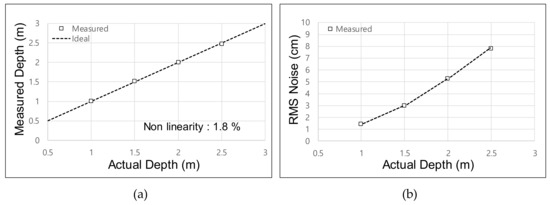 Measured depth from the fabricated sensor chip: (a) measured depth; (b) root-mean-square (RMS) noise.