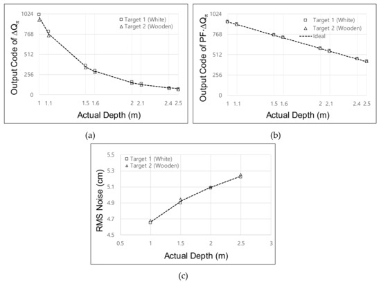 Figure 9a shows the measured depth over the range of 1–2.5 m. For the four-phase operation of depth acquisition, we had to acquire ΔQπ in the first frame and ΔQπ/2 in the second frame. Therefore, the effective frame rate was set as 10 fps for the depth-acquisition experiment. The measured nonlinearity was 1.8%. The minimum root-mean-square (RMS) noise was measured as 1.42 cm at a distance of 1 m, as shown in Figure 9b. The frame rate of 10 fps was used only for the depth acquisition using the four-phase operation. The depth frame difference using the proposed two-step comparison scheme was measured at 20 fps because only a single frame of integration was needed to acquire ΔQ. We allocated a modulation time of 25 ms for all 128 sub-integration times. Reducing the modulation time enhances the frame rate but degrades the depth accuracy. The frame rate is expected to be improved by optimizing the responsivity of the PPD in further research.