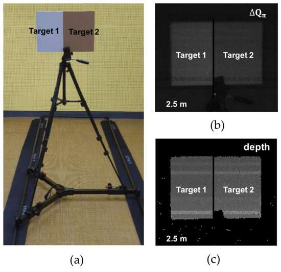 Testing environment and captured images from the fabricated sensor: (a) testing environment; (b) infrared (IR) image of ΔQπ without application of a two-step comparison scheme; (c) depth image with application of a conventional four-phase modulation scheme.