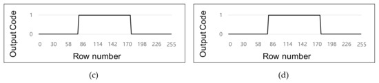 Figure 12a,b show the line images of the depth frame difference that were generated from the test column with application of the four-phase modulation scheme and the proposed two-step comparison scheme, respectively. Figure 12c,d show the result of binary quantization. The threshold of the binary detection was set as 10 cm. In both results, no detection error was found regardless of the reflectivity.