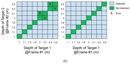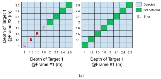Figure 13 summarizes the result for the depth frame difference. Without the two-step comparison scheme, the frame difference was not detected in a significant portion of the range. Moreover, the detection results exhibited differences due to the different reflectivities. With the two-step comparison scheme, the frame difference was successfully detected in the entire range for both target objects with different reflectivities.