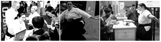 Left: a group of high-school students are asked by the researcher (one of the co-authors of the paper) to participate in the activity. In the background, two members of the Aikime dojo. Center: execution of the suwari waza tai sabaki shikko ho technique with arms opened (increasing moment of inertia/reducing angular speed). Right: debriefing to the participants after filling out the tests. Photos left and right at Feria Madrid 2019 event were taken by divulgaUNED and published on Twitter [12].
