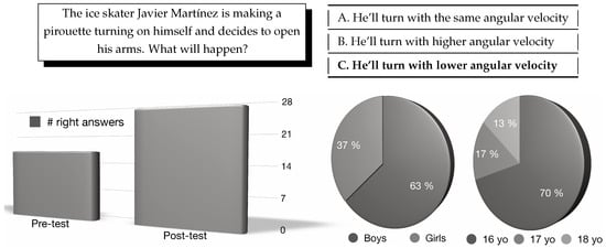 In order to evaluate the understanding of the concept of moment of inertia, the question shown in Figure 2—top, including its three possible answers, was presented to the students who came to the UNED stand, both before (pre-test) and after (post-test) watching the shikko movement. A total of 30 students (average age 16.4 years) took part in the study (Figure 2—bottom). In the pre-test, 17 participants answered correctly, while 27 answered correctly in the post-test. The t-student analysis shows that the results are statistically significant (; ). This field study showed how the u-turn shikko movement allowed high-school students to understand the relation between the moment of inertia and angular velocity. In addition, as discussed in the theoretical analysis in Section 6, other concepts besides the moment of inertia can also be learnt through other aikido techniques.