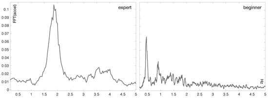 Figure 3 shows two plots of the FFT (Fast Fourier Transform) of the acceleration signal recorded with an iPhone 5 for two aikido practitioners (i.e., an expert and a novice one, respectively) performing the shikko movement. The plot corresponding to the expert clearly reveals a central frequency around 2 Hz. On the contrary, the FFT signal related to the newcomer is more heterogeneous.