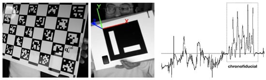 - The board is then shaken N times. During this phase, the board appears blurry from the point of view of all video/depth devices and fiducials are no longer detected (corners also appear fuzzy). However, the attached inertial sensor does effectively sense and measure this (also timestamped) wavy time series pattern. In this context, the rules regarding the generation of chronofiducials (listed at the end of Section 5.1) are fully respected.