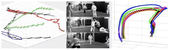 Modern consumer depth cameras use structured light and machine learning. Inferring the position of a body entails: (1) computing a depth map (using structured light) and (2) inferring the position of the body by means of machine learning. The depth map is built by analyzing a speckle pattern of infrared laser light. This entails the projection of a known pattern onto the scene and the determination of its depth from the deformation of the aforementioned ornaments. There exist several machine learning implementations for skeleton tracking. One of the most widely used and deployed versions (and also embedded in the software inside many of the consumer sensors) is NiTE, succinctly described in [33]. These kinds of sensors have also been used to monitor and infer movements from practitioners in other martial arts, such as Taekwondo [34]. Kinect-like devices not only measure depth, but, as affirmed above, they can also report a body’s position and track movements with fair precision, even for specific body parts and quick movements. This feature is shown in Figure 5—right to track the movement of two aikido practitioners when performing a movement called shomen-uchi kotegaeshi.